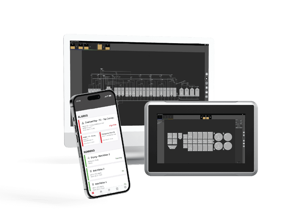 Grain Control Flow använder insamlad data från alla sensorer i anläggningen för att styra processerna automatiskt. Detta presenteras i användarvänliga gränssnitt, såsom Grain App.